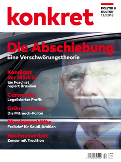 konkret möchte sich an dieser Stelle bei den Leserinnen und Lesern für ihr Engagement bedanken. Ihre Mitteilungen, wo zu kaufen beziehungsweise nicht zu kaufen war, haben sehr geholfen. Viele haben uns auch durch Spenden gezeigt, dass ihnen das Erscheinen von konkret etwas wert ist (Spendenkonto: Deutsche Bank, IBAN DE54200700240841271002, BIC: DEUT DEDBHAM). Der Verlag dankt insbesondere Jutta Ditfurth und den Journalistinnen und Journalisten des »Neuen Deutschland«, der »Jungle World«, der »Taz«, des »Altpapier«, die – im Gegensatz zur Konzernpresse und ihren nationalen »Recherchenetzwerken« – über das »Vertriebsverbot« berichtet haben. Die Ausgabe konkret 10/18 ist ausnahmsweise auch als PDF erhältlich (Bestellungen an verlag@konkret-magazin.de).